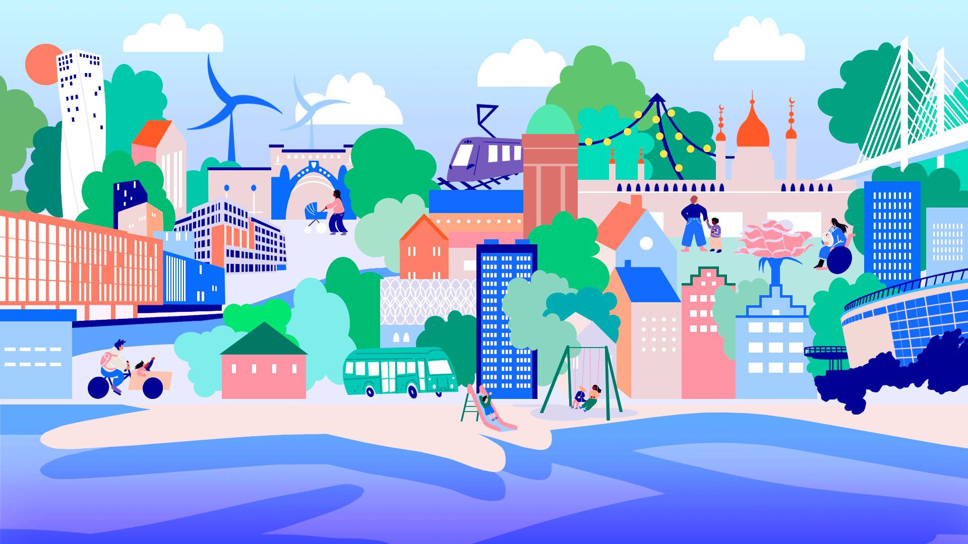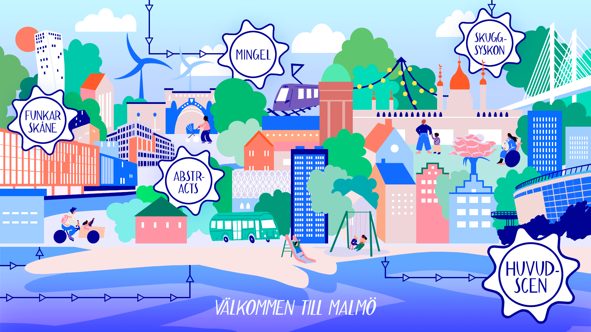 Illustration of Malmö City. Landing page for the digitally broadcast two-day conference for people working in habilitation. The illustration is the lobby of the digital platform and the place you come back to when you want to navigate to one of the different rooms.